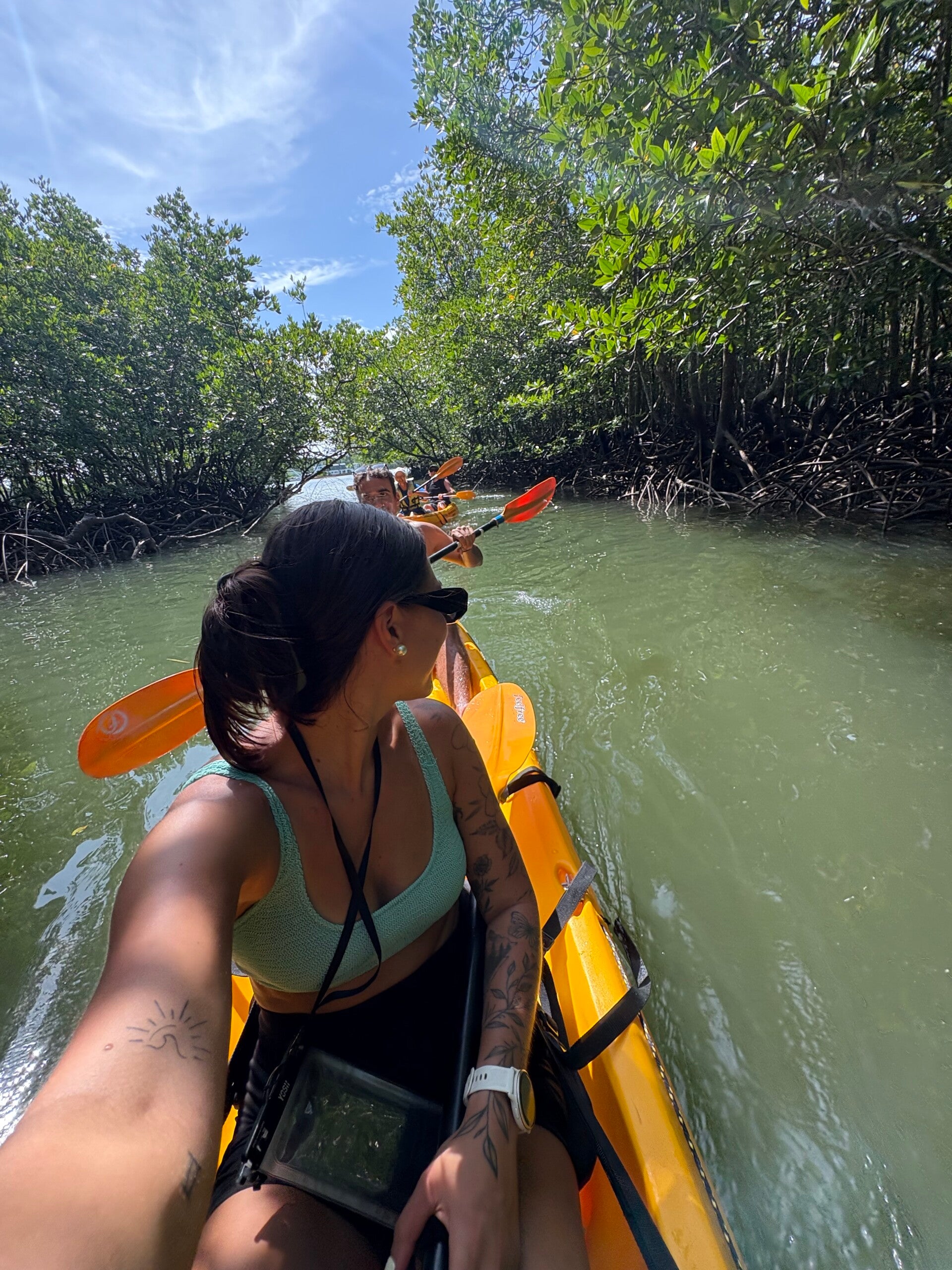 Nach etwa 40 Minuten erreichten wir unser Ziel: den Mangrovenwald. Dort bekamen wir alle ein Paddel in die Hand gedrückt und ein Kajak zugewiesen. Kosi und ich saßen gemeinsam in einem, während Mama und Papa sich ein eigenes teilten.