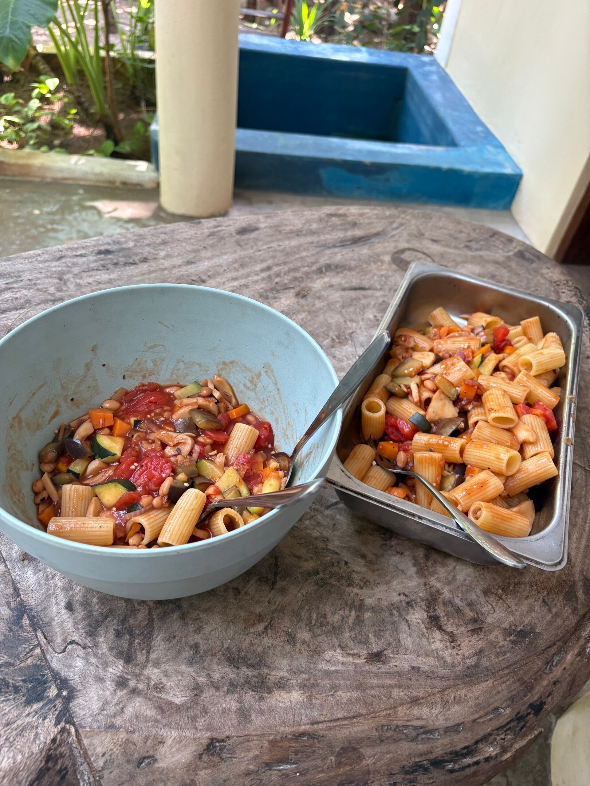 Am Nachmittag ging’s dann auf den Markt. Wir sammelten einen bunten Mix: Auberginen, Zucchini, Tomaten, Karotten, Bohnen, Pilze, Ingwer, Gurken… der Sack wurde immer schwerer. Zurück in der Unterkunft kam der neue Herd gleich zum Einsatz – es gab Nudeln mit Gemüse, unser Klassiker. Und diesmal funktionierte alles ohne Notlösung.